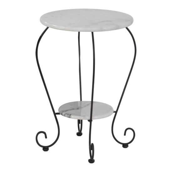 Een klassieke bijzettafel, het onderste blad heeft een doorsnee van 25 cm, het bovenste blad is wat groter met een doorsnee van 41 cm. De klassieke look van dit bijzettafeltje wordt versterkt door de de poten met ronde vormen en sierlijke krullen. Het onderstel is gemaakt van gietijzer dat samen met de marmeren tafelbladen een stevig geheel maakt van deze dubbele bijzettafel.