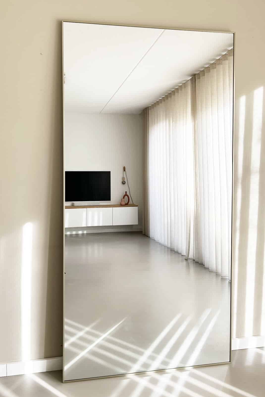 Deze grootformaat spiegel in de kleur greige uit onze collectie Finn staat mooi in de hal, woonkamer of slaapkamer, maar ook zeer geschikt als spiegel in de sportschool of yogastudio.